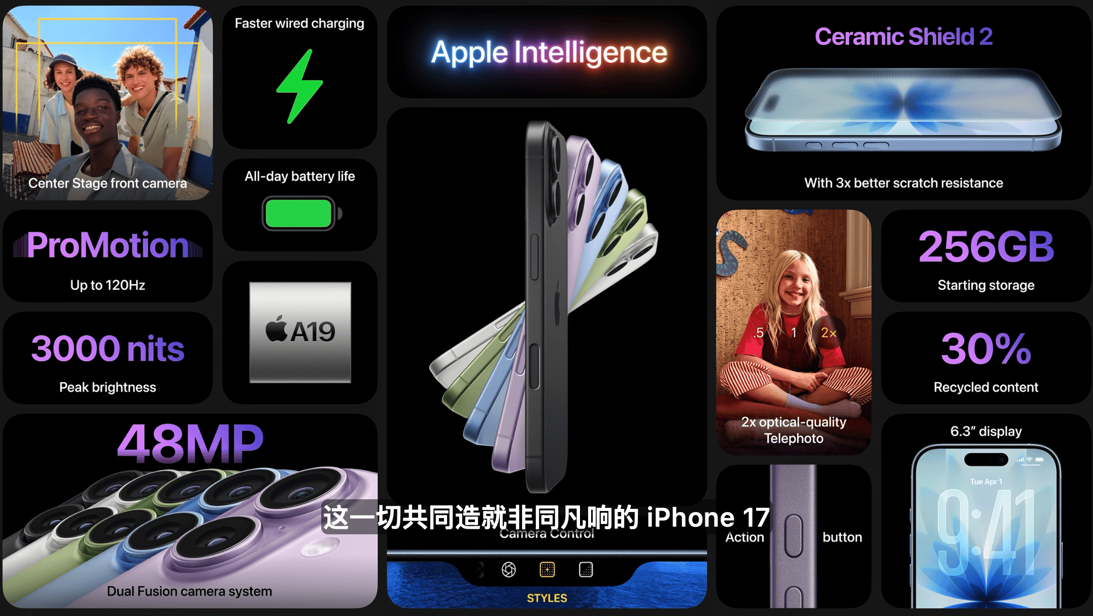 概括而言,该系列“拥有突破性的电池续航力,配备我们迄今最出色的显示屏,并由超瓷晶面板正面守护。强悍的A19 Pro芯片采用第三代3纳米制程,配备VC均热板。还有全上4800万像素的后置摄像头,以及全新Center Stage前置摄像头”。