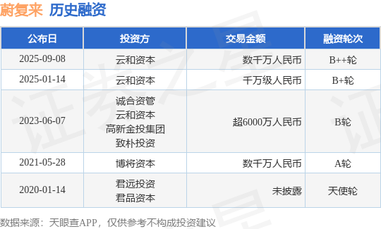 证券之星消息,根据天眼查APP于9月8日公布的信息整理,蔚复来(浙江)科技股份有限公司B++轮融资,融资额数千万人民币,参与投资的机构包括云和资本。