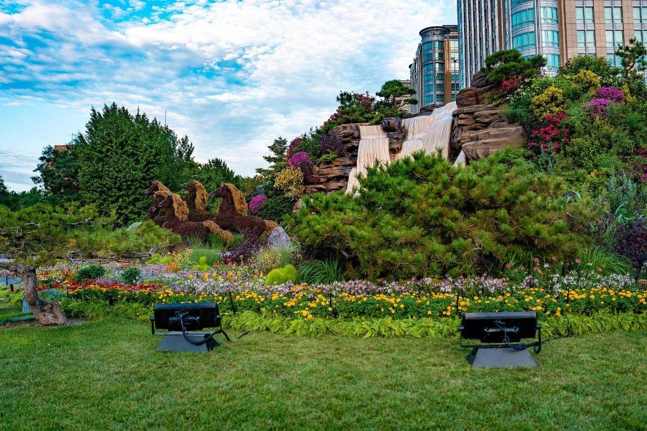 地面花卉以自然式花境布置为主,群马以观赏草为背景搭配柳叶白菀等白花植物还原群马水边奔腾的景象,与黄河瀑布的壮观景象呼应,形成一幅波澜壮阔的花坛景观。